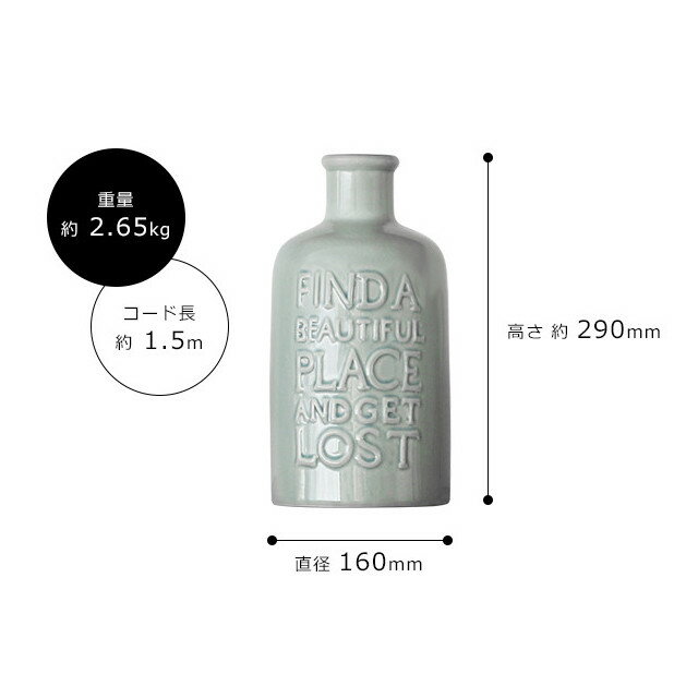 サイズ 約 直径16x高さ29 cm 電源コード 1.5m 重量 約2650g 材質 本体:ABS・PP、タンク:ABS、本体カバー:陶器、アロマトレー:PP 電源 AC100V 50/60Hz 消費電力 弱:10W、中:13W、強:15W タンク容量 約0.9L 連続使用可能時間 15時間(弱)〜5時間(強) 加湿能力 弱:60ml/h、中:110ml/h、強:160ml/h(±20%) 適用床面積 木造和室2畳、プレハブ洋室5畳 オフタイマー 1・2・4時間 電気代 約0.35円 ※1時間あたりの目安(新電力料金目安単価) 保証 お買い上げ後1年間 【lump】Onlili オンリリ の 陶器加湿器 は おしゃれ な 超音波式加湿器。