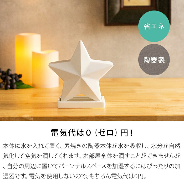 電気代は0(ゼロ)円! 本体に水を入れて置くと、素焼きの陶器本体が水を吸収し、水分が自然気化して空気を潤してくれます。