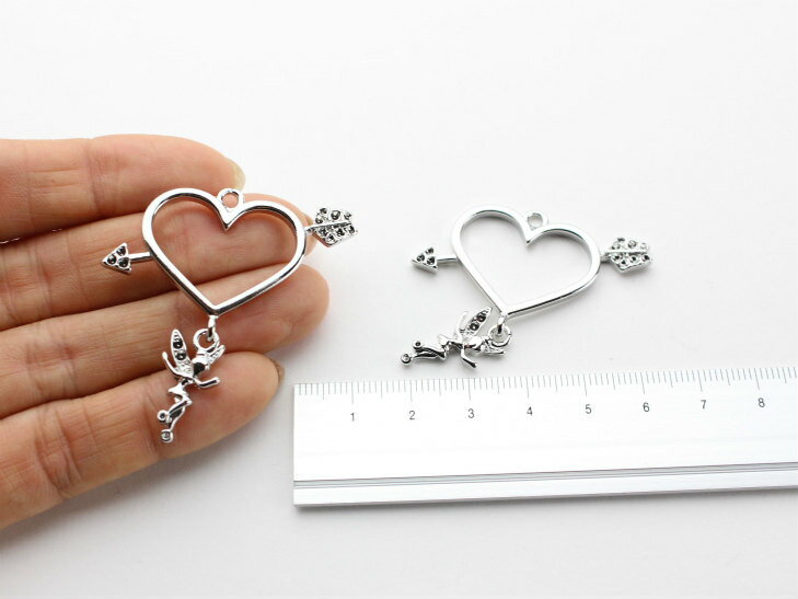レジン空枠【妖精チャーム付ハート(約27.2x43.8mm)シルバー 1個】天使の矢 レジン枠 キューピット アクセサリーパーツ ハンドメイド資材 ちょこっと